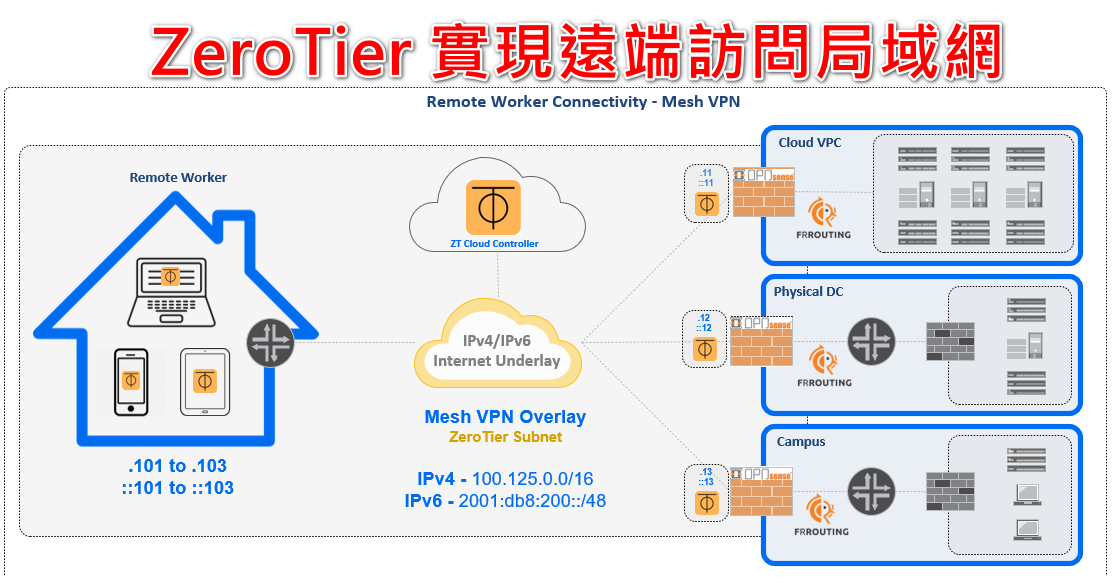 `ZeroTier`可以透過其中一部裝置實現遠端訪問整個局域網功能,從而避免不能安裝`ZeroTier` 軟件 或 解決多次安裝軟件於不同裝置的問題。